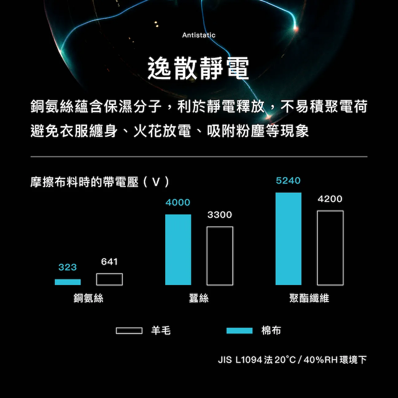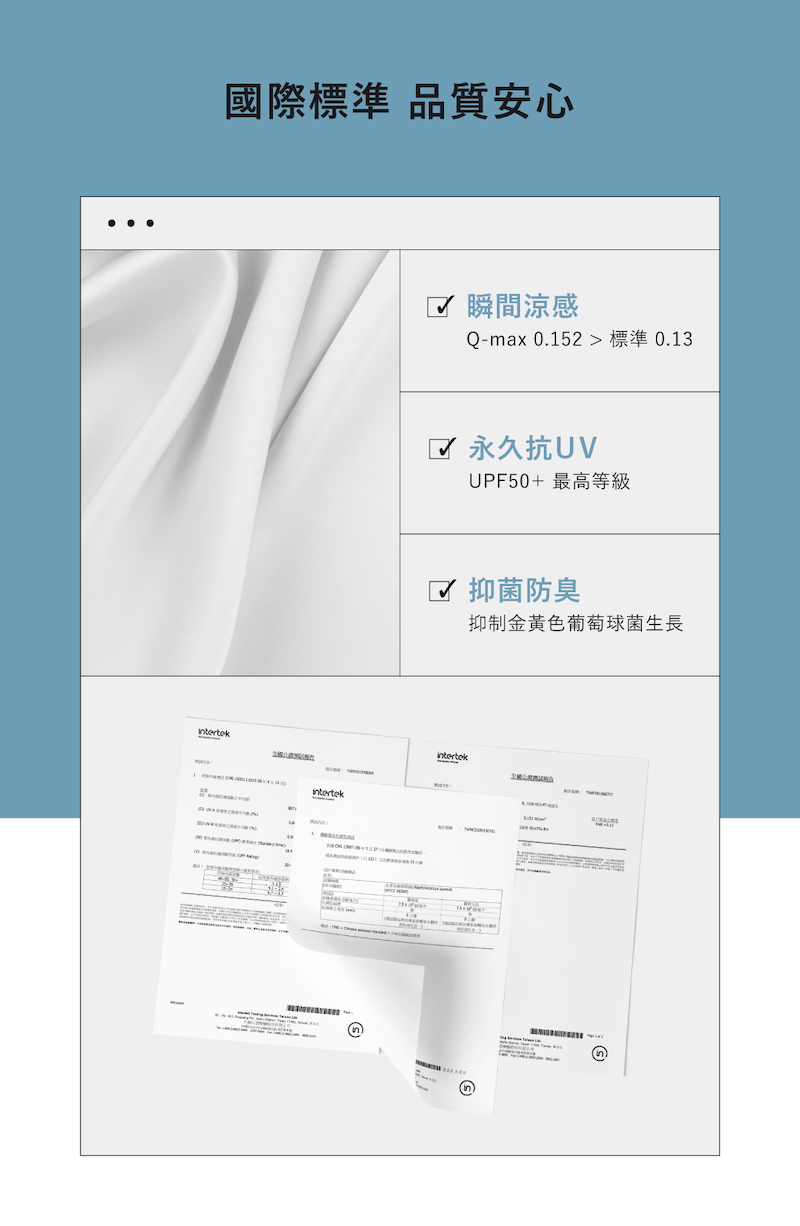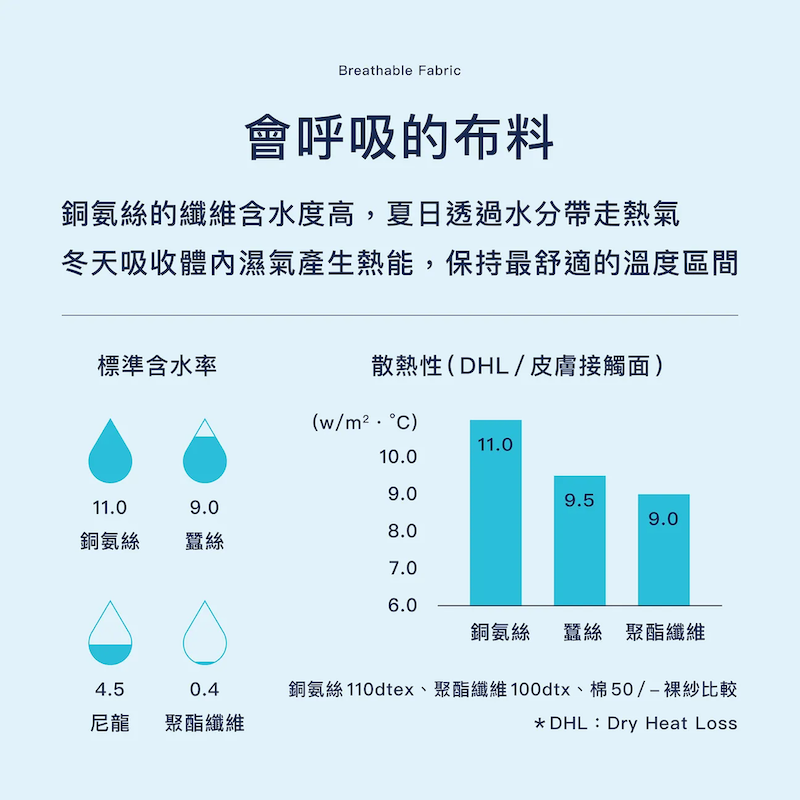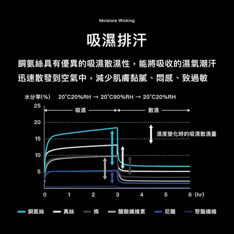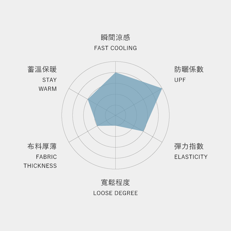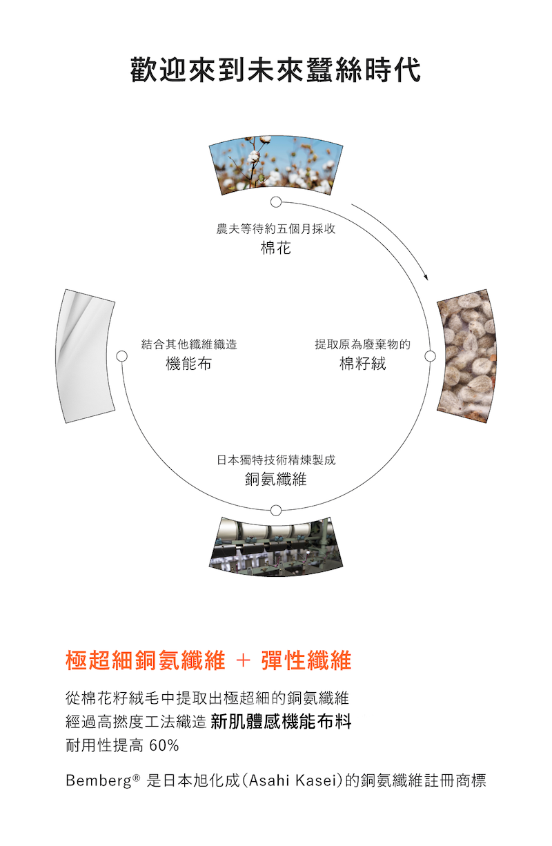 採用 65% 頂級銅氨絲,提供 UPF 防護與瞬間涼感,