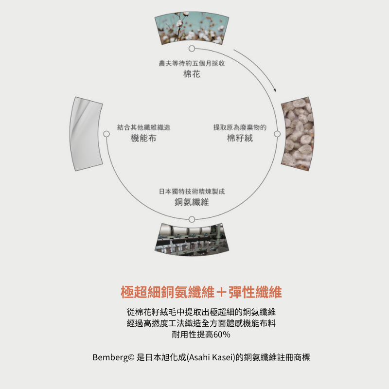 日本 Bemberg™ 銅氨絲擁有獨特的纖維結構,富含水分子,能智慧調節體感溫度。