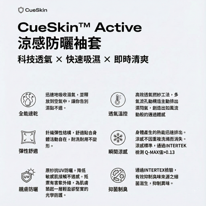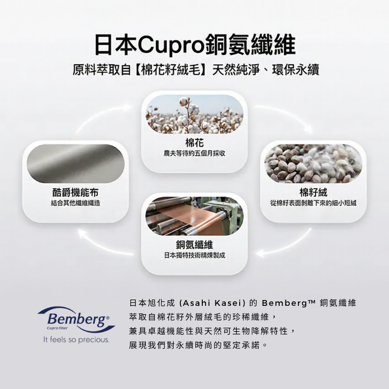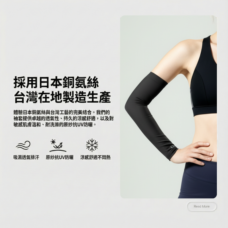 採用日本 Bemberg™ Cupro 銅氨纖維,做出「高透氣 × 吸濕速乾 × UPF 防護」的貼膚袖套,長時間配戴依然乾爽不黏。