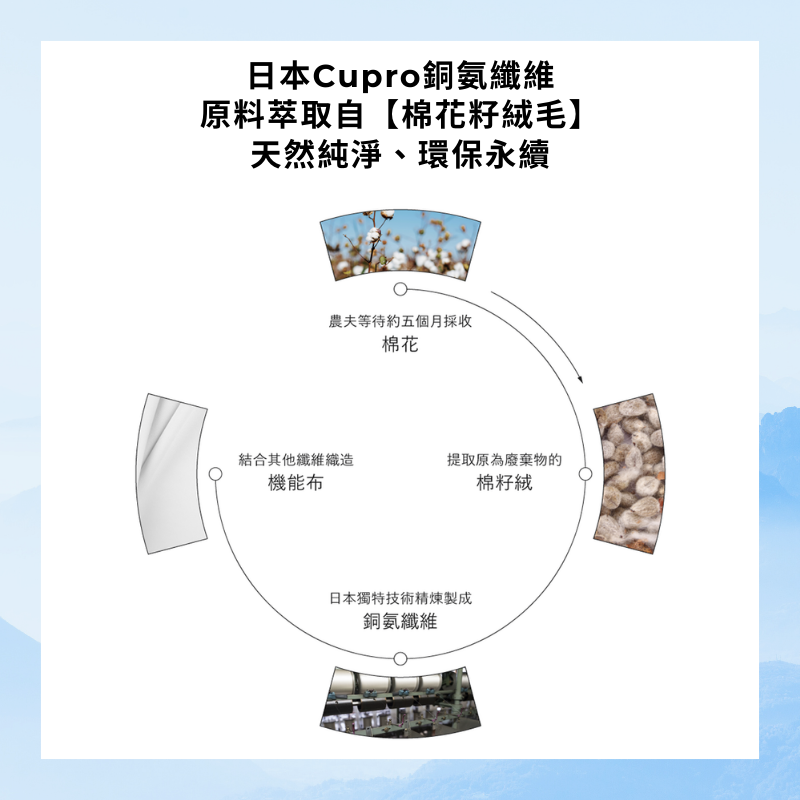 銅氨絲 (Cupro Fiber)萃取棉花籽絨毛,無添加化學助劑,機能特性不因洗滌次數而消失。