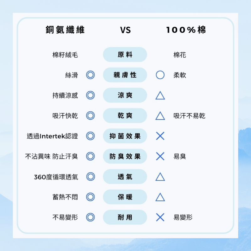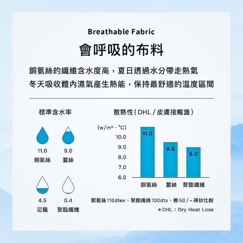 選用日本進口 Bemberg™ 銅氨絲,360° 環繞透氣結構+優異吸濕排汗機能,