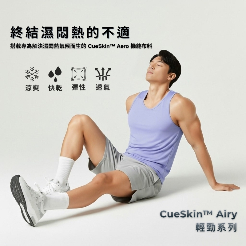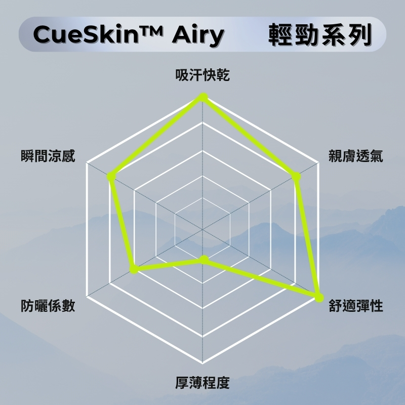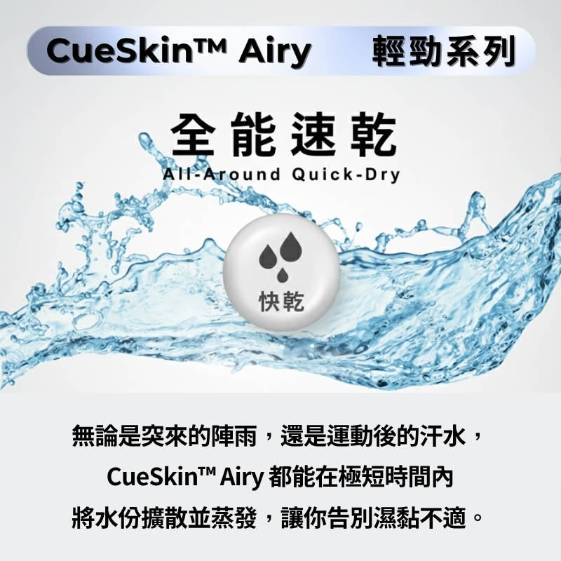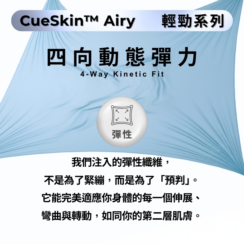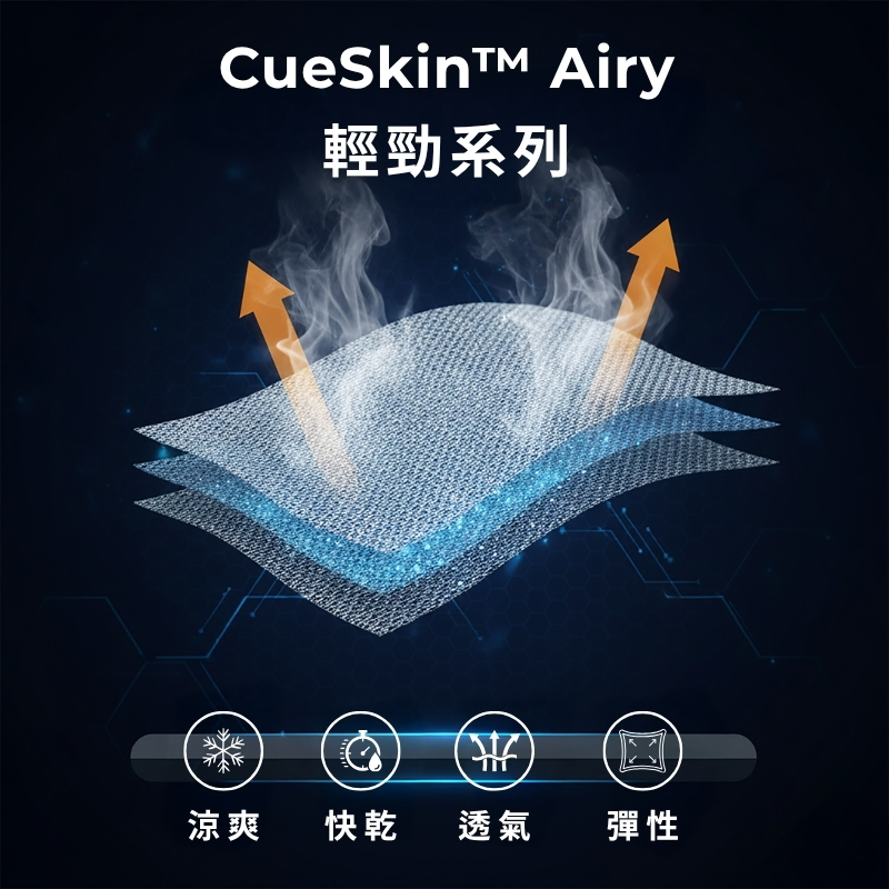 CueSkin™ Airy 採用 Bemberg™ Cupro 銅氨纖維,具備卓越的吸濕排汗與 360° 透氣機能,快速導走汗水並蒸發,保持乾爽,專注表現不受干擾。
