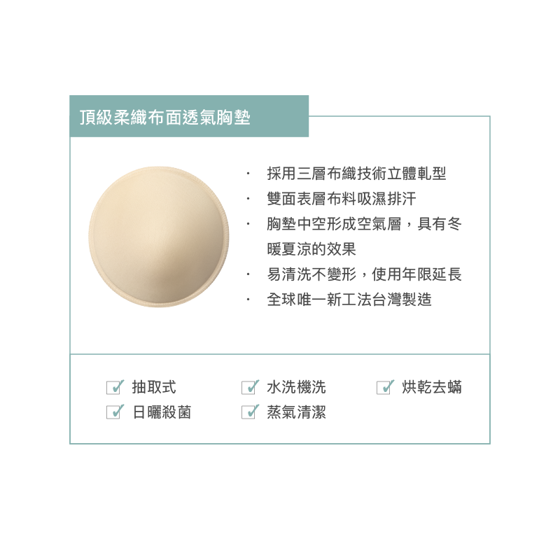 可拆式針織罩杯胸墊,採用針織技術所製。直立織法讓胸墊充滿透氣通道,且更加強支撐性。透氣度與使用之清潔性勝於泡棉式罩杯,透氣不易藏污納垢。